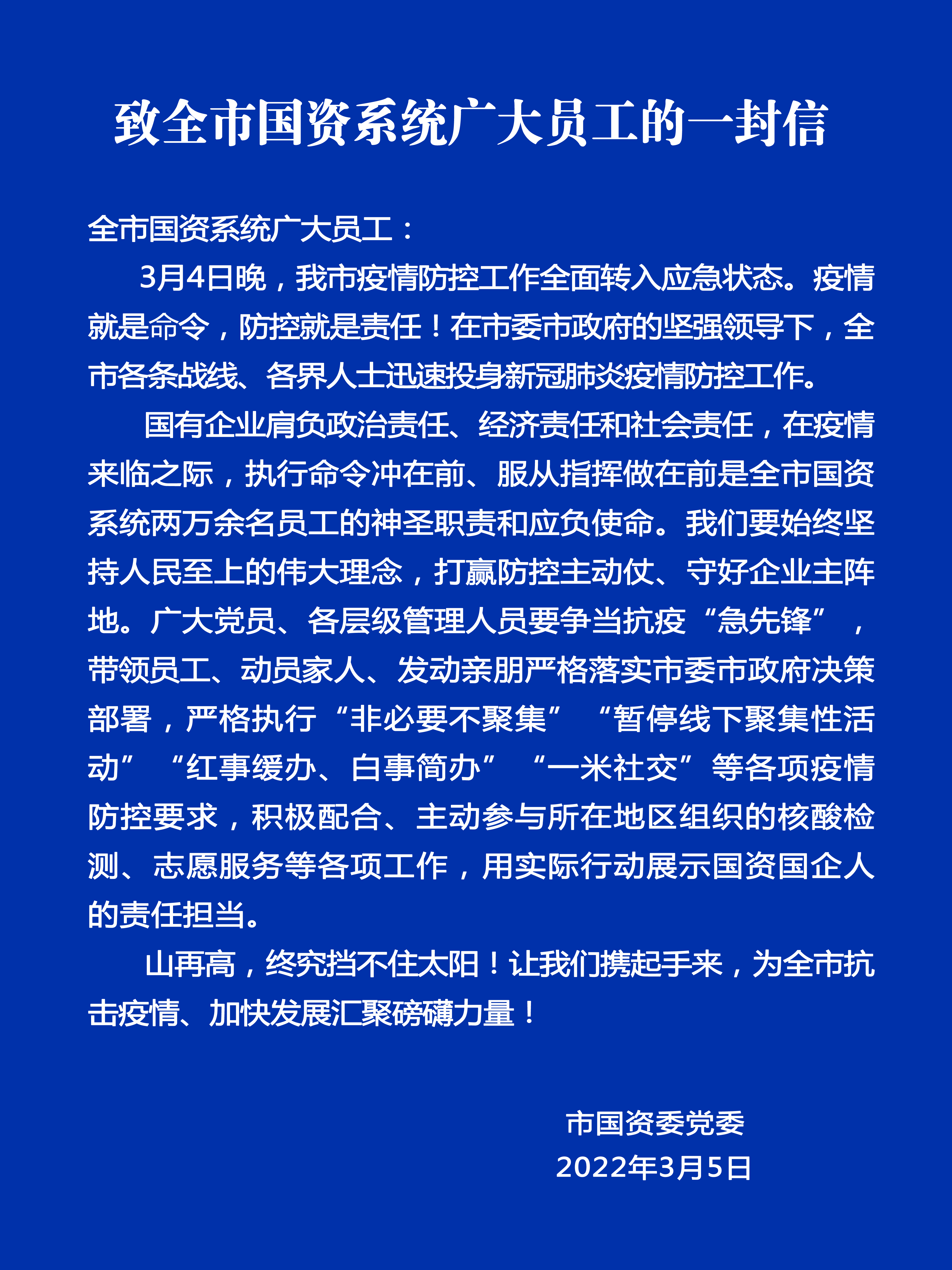 致全市国资系统广大员工的一封信