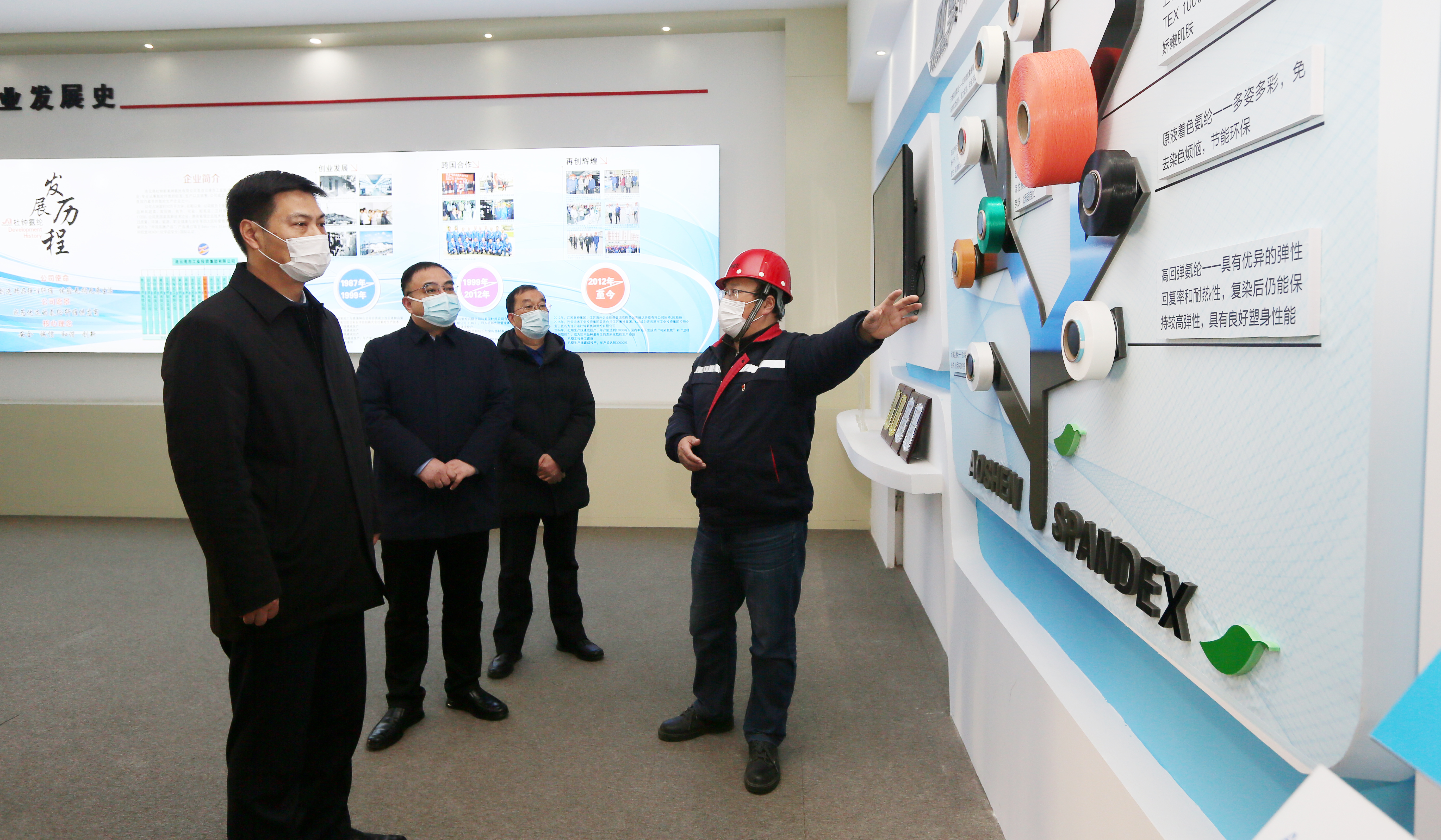 魏爱春一行先后走访了氨纶公司、神特公司,考察了八期生产线、研发中心等项目,了解了企业发展规模、生产经营、发展愿景、产品研发、科技创新等方面情况。