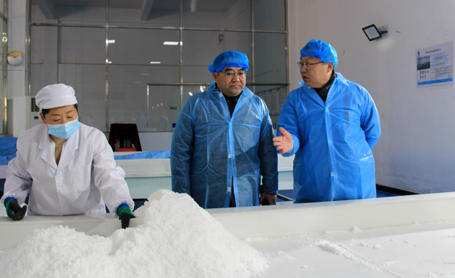 杨龙察看了金桥制盐公司雪花盐车间、加工盐车间、包装盐车间生产现场,详细了解企业近期的产品生产销售情况,要求该公司要继续抓好疫情防控、产品市场开拓和冬季安全生产工作。