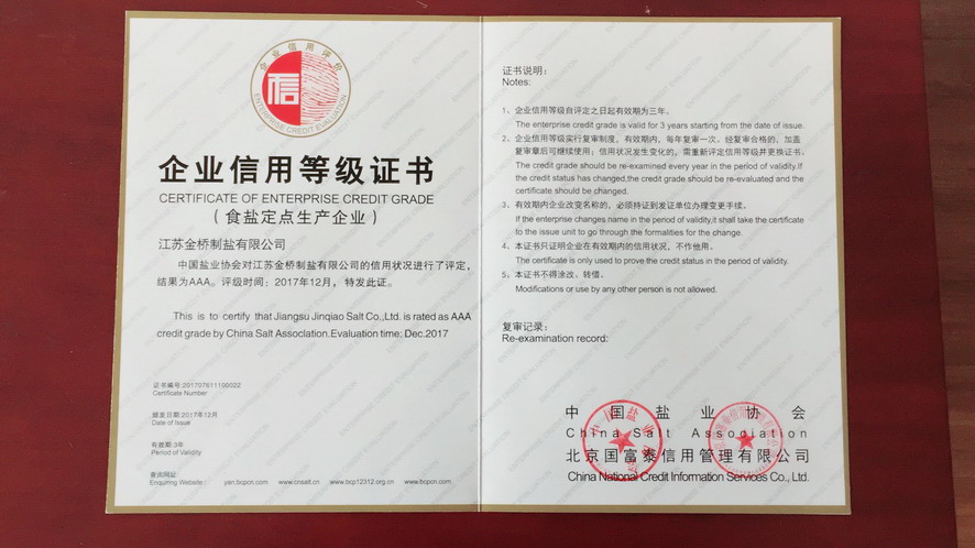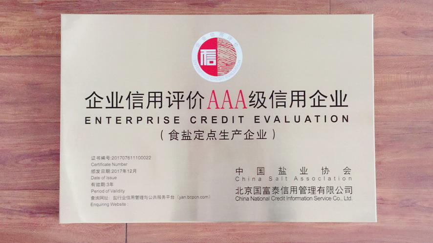 按照主营业务收入、利润、主营业务收入利税率及主营业务增速四项指标评价,2016年半岛平台网站登录入口_半岛(中国)公司被中国轻工业联合会和中国盐业协会评为中国轻工业制盐行业十强企业。根据《社会信用体系建设规划纲要(2014—2020)》,经第三方专业评价机构和中国盐业企业信用等级评价委员会审核并向社会公示,2016年江苏金桥制盐有限公司被评为AAA级食盐生产企业。
