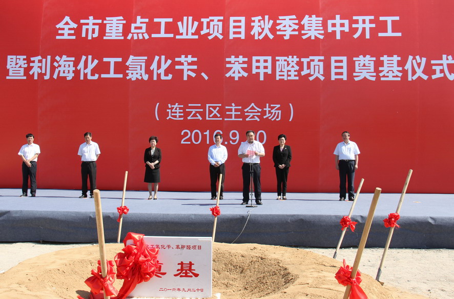 9月20日,我市重点工业项目秋季集中开工(连云区主会场)暨利海化工氯化苄、苯甲醛项目奠基仪式在利海公司举行,市委书记、市人大常委会主任杨省世,市领导杨莉、董恕娟、徐家保、鲁林,半岛平台网站登录入口_半岛(中国)公司董事长、党委书记杨龙、总经理胡建明等出席开工仪式。