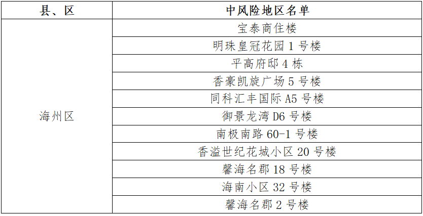 海州区同科汇丰国际C10号楼、紫金公馆3号楼、兴业时代花园B6号楼、兴业时代花园C6号楼、九龙城市乐园77号楼、明珠皇冠花园20号楼、华润公寓、双龙村涧西队65号、众兴华庭10号楼、壹品国际C区、香溢世纪花城小区2号楼、明珠皇冠花园11号楼、小学路11-1号楼、兆隆城市洋房A号楼、振兴小区2号楼、易居公馆4号楼、浦润花园4号楼由中风险地区调整为低风险地区。