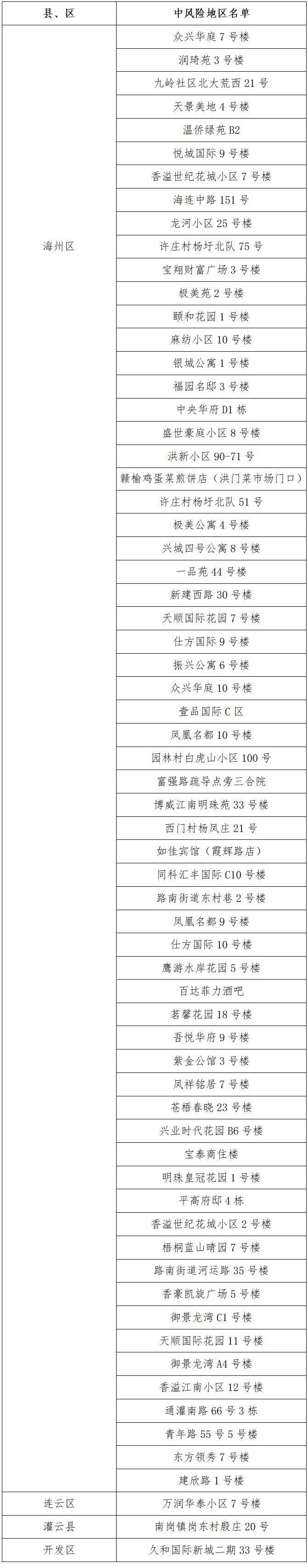根据国务院联防联控机制有关规定,经综合评估研判,市指挥部决定,自发布之日起,将海州区茗馨花园18号楼、吾悦华府9号楼、紫金公馆3号楼、凤祥铭居7号楼、苍梧春晓23号楼、兴业时代花园B6号楼、宝泰商住楼、明珠皇冠花园1号楼、平高府邸4栋、香溢世纪花城小区2号楼、梧桐蓝山晴园7号楼、路南街道河运路35号楼、香豪凯旋广场5号楼、御景龙湾C1号楼、天顺国际花园11号楼、御景龙湾A4号楼、香溢江南小区12号楼、通灌南路66号3栋、青年路55号5号楼、东方领秀7号楼、建欣路1号楼调整为中风险地区。