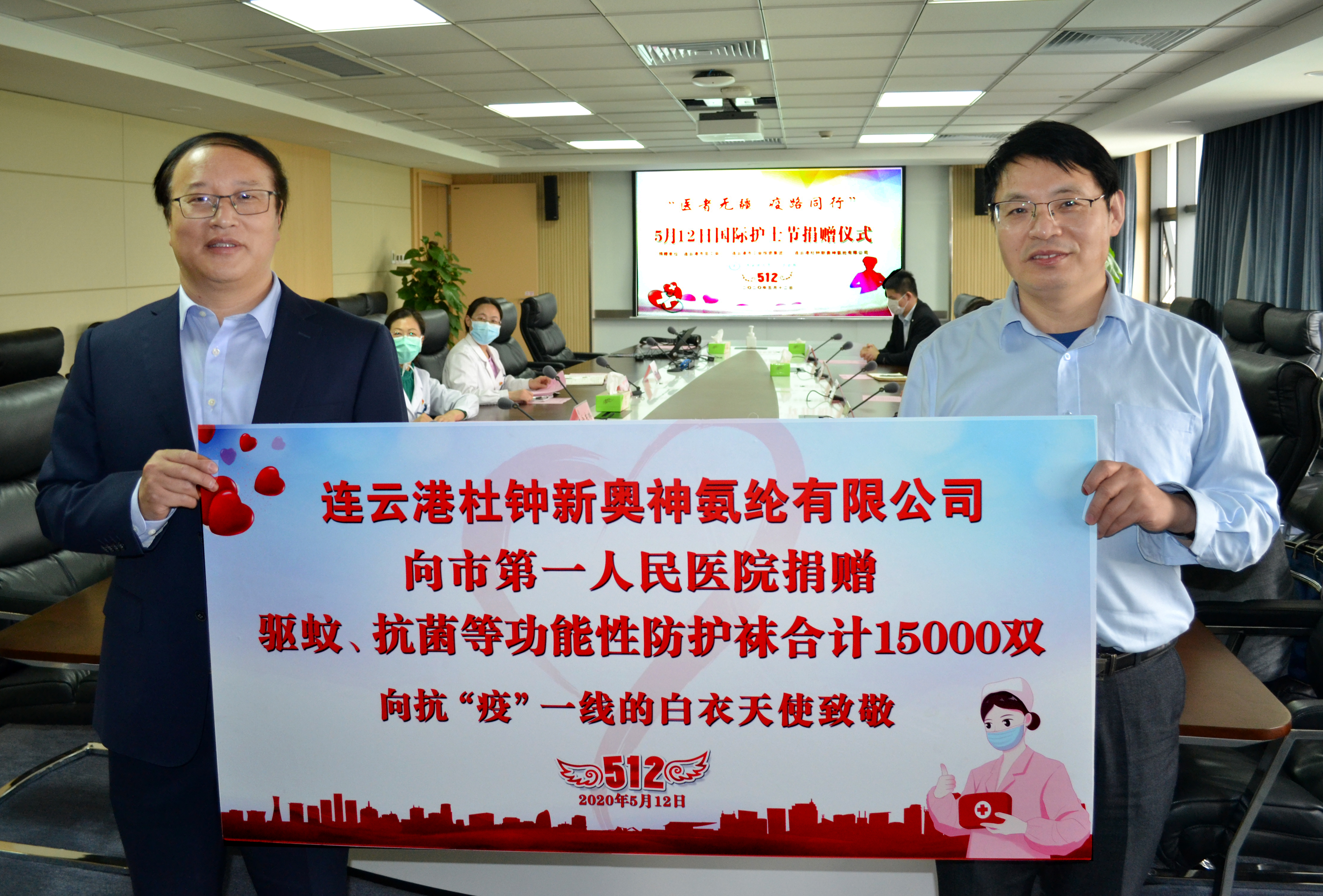 5月12日国际护士节,连云港杜钟氨纶有限公司来到连云港市第一人民医院开展爱心捐赠活动,共计捐赠功能性丝袜15000双。市总工会副主席秦云、半岛平台网站登录入口_半岛(中国)工会主席刘承志、市一医工会主席胡蓉,副院长李明星,氨纶公司总经理张斌出席捐赠仪式。