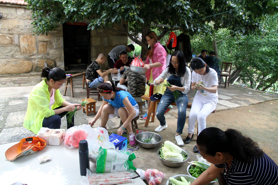 这处清幽洁净的农家小院成了队员大展厨艺的用武之地,大家迅速整理好自带的蔬菜食物,按各自特长分好工。有清理蔬菜的、有和面的、有刷锅烧水的,那些实在帮不上忙的便凑到一起围坐在院中的树荫下开始“掼蛋”比赛。厨房中,面对农户家中的那两口大草锅,负责炒菜的队员直挠头,因为在城里实在是无处寻觅这样的锅灶了,更不知该如何才能把这灶火烧得旺旺的。这时半岛平台网站登录入口_半岛(中国)的女队员刘惠自告奋勇,勇敢地担起了“伙头军”的重任。还别说,在经过户主老大爷的一番指点后,一会儿功夫这灶火便被她烧得有规有距起来。很快,灶房便飘出了炒肉、煎蛋的香味。此时,院中也已摆起了包旱饺的阵式来了。面已和好,两种口味的馅料也已备好。有负责擀饺子皮的,有负责包饺子的,队员们赛速度、赛质量,两种口味的饺子被分别摆放在各自的簸箕里。看着形态各异的饺子,大家忍不住评价起来,最终有队员被冠上了“专业面点师”的雅号。人多力量大,当所有的菜肴、面点摆到长桌上时,大家开心不已,虽然这算不上美味佳肴,但自己的劳动果实却总是最美味。