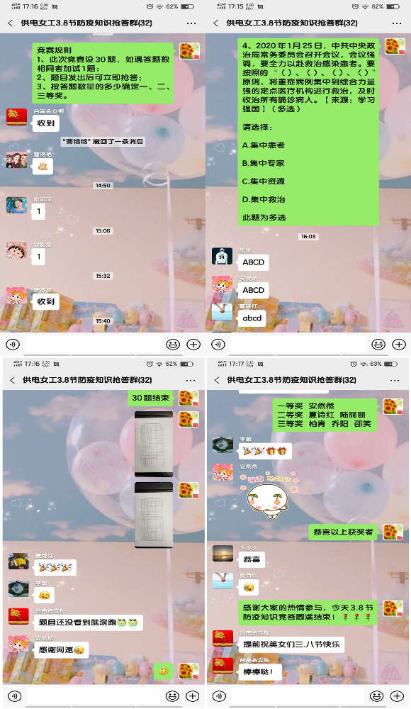 2020年第110个国际“三八”妇女节来临之际,为了让公司女职工在做好自身疫情防护的前提下,能够度过一个健康、愉快、充实的节日,公司女工委利用微信群组织全体女职工开展了庆“三八”抗新冠疫情防护知识抢答赛活动。
