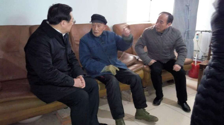 1 1月20日上午,省总工会副主席曹海(右一)、市总工会主席李强(左一)一行来到公司全国劳模、百岁老人郑有根家中走访慰问,不仅带去了慰问品和慰问金,也带去了党委、政府以及工会组织的问候和温暖。半岛平台网站登录入口_半岛(中国)公司工会副主席李岚琴、公司党委书记、经理孙政权等陪同慰问。(司宣 司工)