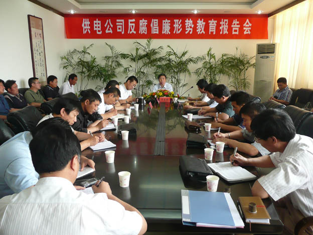 近日,我公司邀请了市纪委常委、市纪委秘书长、市监察局副局长雷生保同志来我公司作反腐倡廉形势教育报告,公司领导、机关中层干部、各供电所领导班子及部分职工代表参加了会议。