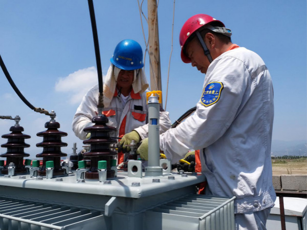 7月19日上午,台南供电所施工人员对宝旺钢材城变压器更换工程项目进行施工。在34度高温和人员不足的情况下,该所干群齐心协力仅用2个小时完成了1台315KVA变压器、配电箱等一系列更换工作,用高效率的施工贯彻落实公司“二届四次职代会主席团联席会”会议精神。(台南供电所)