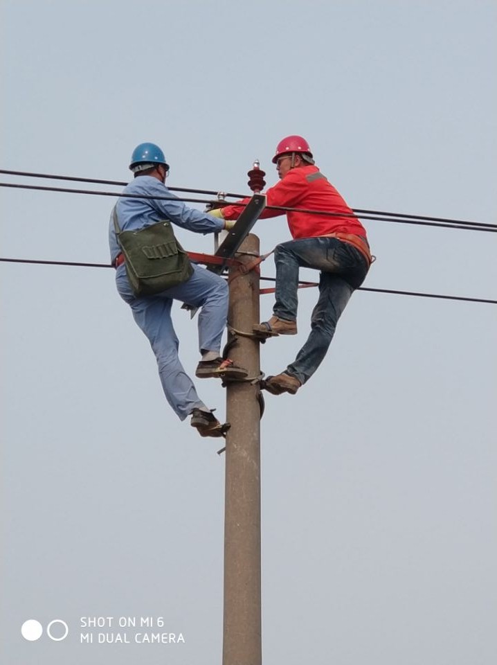 5月2日,张圩新农村小区配电安装工程施工现场,一根15米的电线杆上,荣获半岛平台网站登录入口_半岛(中国)“技能大师”称号的王建采用实践教学的方法,亲自为新员工祁明智做登杆、金具安装、导线捆绑等示范操作,促其尽快掌握技术要领。