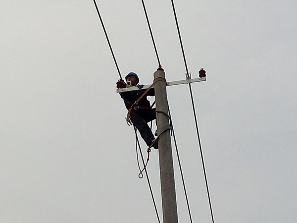 随着台南养殖线改造工程的正式施工,供电公司前期新招聘的外线工正式上杆作业。