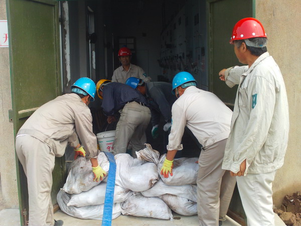 总指挥长宣布演练开始后,变电所值班工及相关人员迅速拿出抢险储备物资:潜水泵、编织袋、锹、铣等,按照各自分工,编织袋装泥垒起拦水防线,潜水泵向防线外迅速抽水,直至灾情全部控制为止。通过应急演练,切实提高了汛期突发事件的应急处理能力。(马德松)