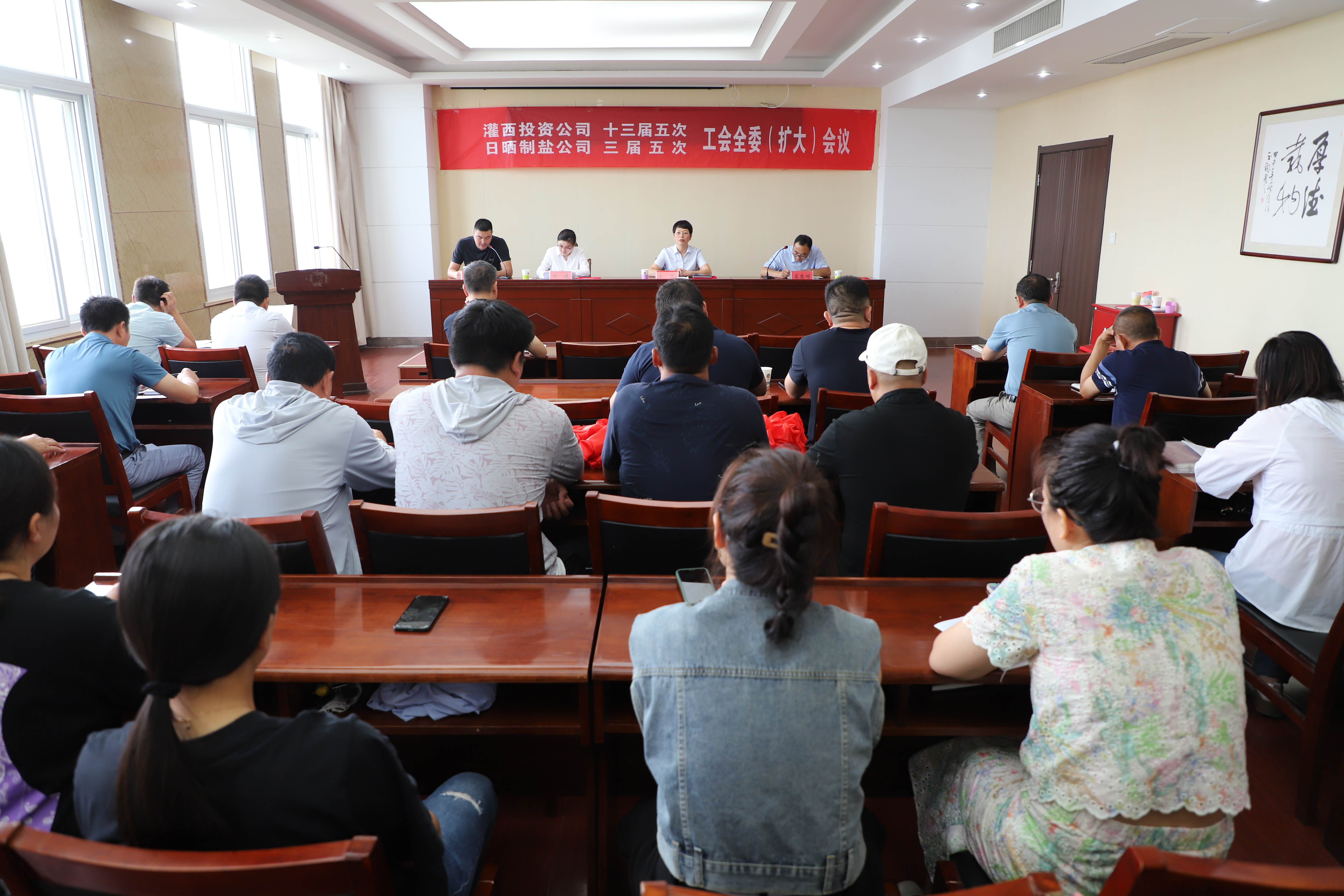 8月17日,灌西投资公司召开十三届五次、日晒制盐公司三届五次工会全委(扩大)会议,公司党委副书记、工会主席王宏出席会议,灌西投资公司工会十三届、日晒制盐公司工会三届委员会全体委员,各单位工会主席、女工委员参加会议。