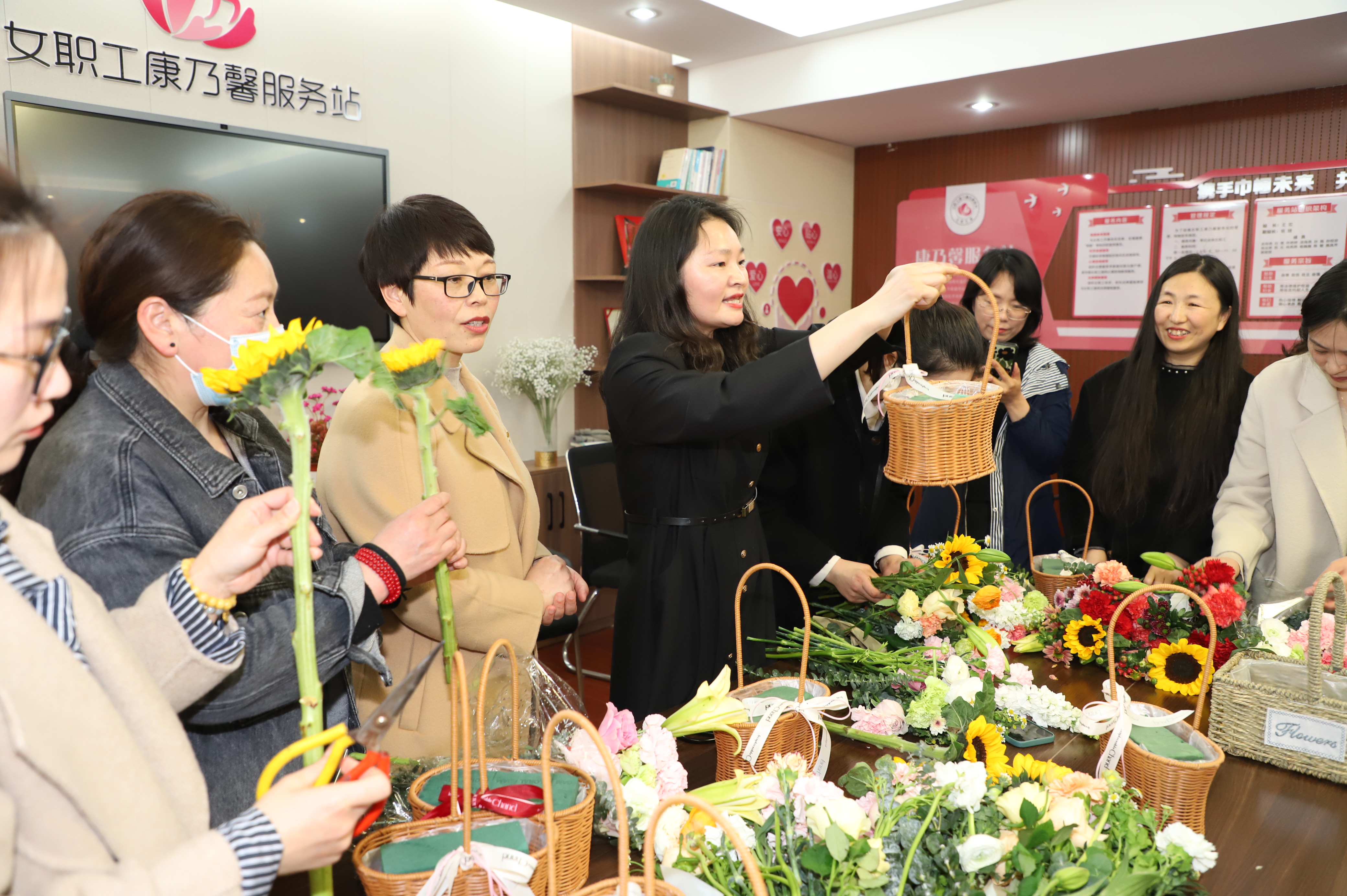 随后开展的艺术插花活动,更是将节日庆祝气氛推向了高潮。活动现场,邀请专业插花老师进行现场指导,插花老师用通俗易懂的语言讲授插花基本技巧,从颜色的搭配、花枝长短的修剪以及造型等方面进行细致讲解,大家也纷纷行动起来,构思设计,在老师的指导下将各种花材修剪和整枝,忙的不亦乐乎。一盆盆姿态各异的花在女神们灵巧的双手下陆续诞生,形成了一幅幅独具匠心又饱含深意的插花作品。感受节日美的“她”,看着自己亲手创作的插花作品,参与活动的30多名女职工感到满满的成就感和幸福感,现场一片其乐融融。