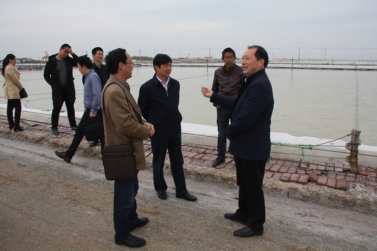 市人社局这次来我公司主要就日晒制盐公司生产环境、一线盐工劳动条件、工作负荷等情况进行现场调研。在埒南制盐分公司九班现场,古浩光副总经理向考察组详细介绍了日晒制盐公司采用传统海水制盐工艺进行矿卤日晒制盐的生产工艺;李国文总经理就劳动用工管理方面进行了介绍,他指出,近两年,公司虽然通过技术创新,逐步利用机械化代替人工,班组用工也由16人精简到10人;但工人的劳动负荷依然比较重,扒盐、活碴、修补塑布等忙个不停,特别在下雨天时,工人还要进行冒雨拉塑布排淡等,工作十分辛苦。