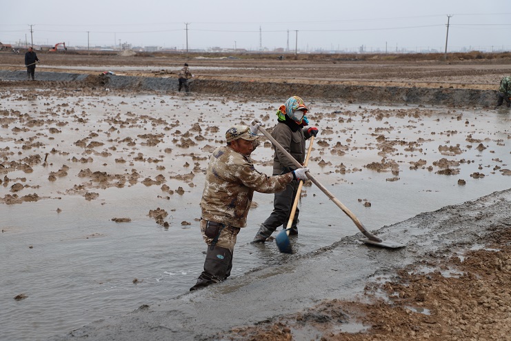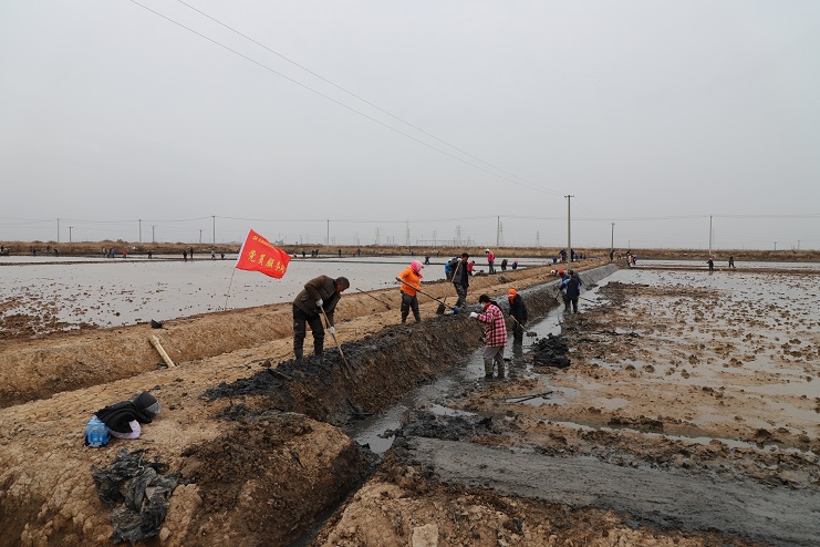 11月29日上午,虽然天气寒冷,但是在海盐基地新改造的制卤滩上,却到处是一派火热的劳动景象,参加“大会战”的工人多达100余人,只见他们有的泼水,有的铲泥,有的捞沟,有的做埝,大家分工协作。据了解,为了提高海水制卤能力,确保海盐产量,今年公司专门对海盐基地部分废弃滩地进行了改造,以进一步增加制卤面积。近期,随着改造工程接近尾声,公司又组织精干力量对新改造滩地继续进行修整,以确保新建的制卤滩地能够尽快投入使用,为明年海盐生产工作的正常有序开展奠定扎实的基础。
