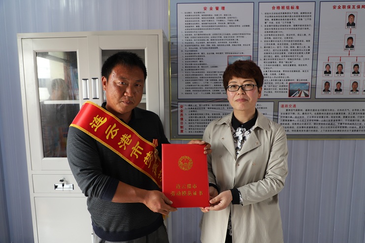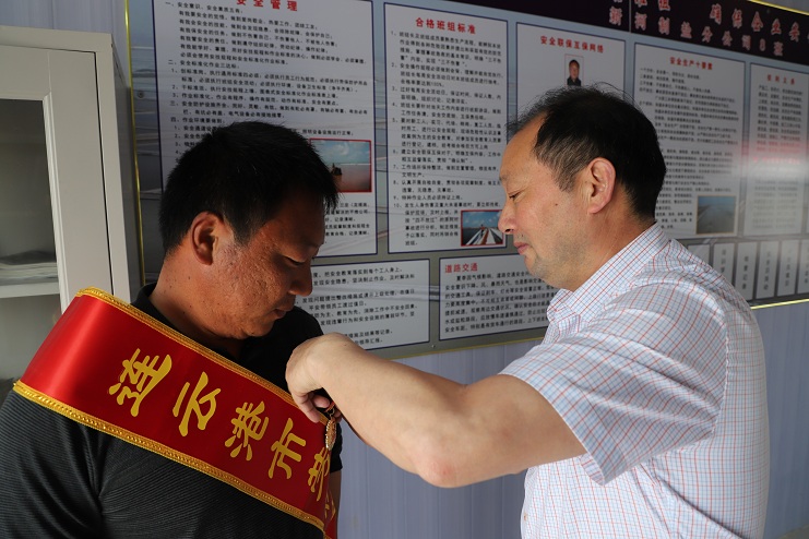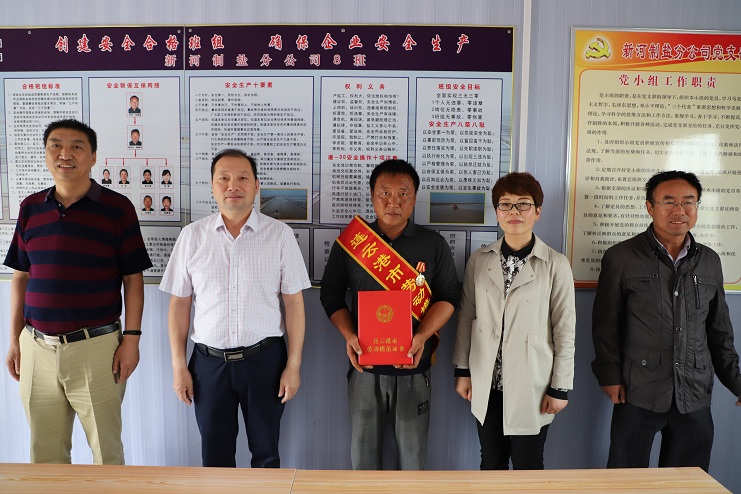 5月22日下午,公司董事长、党委书记李国文、纪委书记、工会主席王宏一行到新河制盐分公司八班为获得连云港市劳动模范的祝星星绶带佩章。