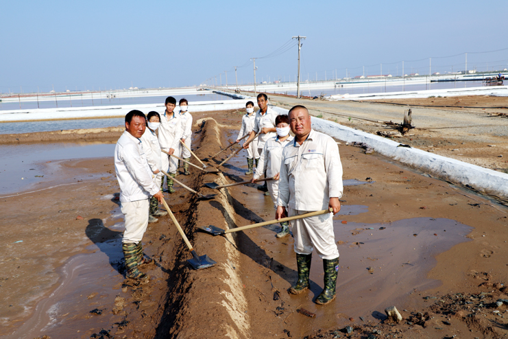 趁着休息的间隙,笔者与身边忙得满头大汗的8班班长祝星星聊了起来。据祝星星介绍,每天员工4点半就到滩头,进行盐池的人工活碴、禀基修复、盐池卤水补充、收放设备检查等一系列工作,因此,合理安排工作量非常重要。他告诉笔者,室外工作工人的劳保服比较厚,一天下来工作服湿了又干,干了又湿,衣服上都泛出厚厚的盐渍。一天下来,全班要消耗2大桶甚至更多的饮用水。现在公司里对半岛平台网站登录入口_半岛(中国)一线生产岗位员工非常关心,防暑降温工作非常到位。最近,单位又为半岛平台网站登录入口_半岛(中国)发放高温津贴、电风扇、防暑降温药品。这些让半岛平台网站登录入口_半岛(中国)员工真切感受到组织的力量,组织得伟大,所以虽说现在比平时更辛苦,半岛平台网站登录入口_半岛(中国)有信心战高温、夺高产。