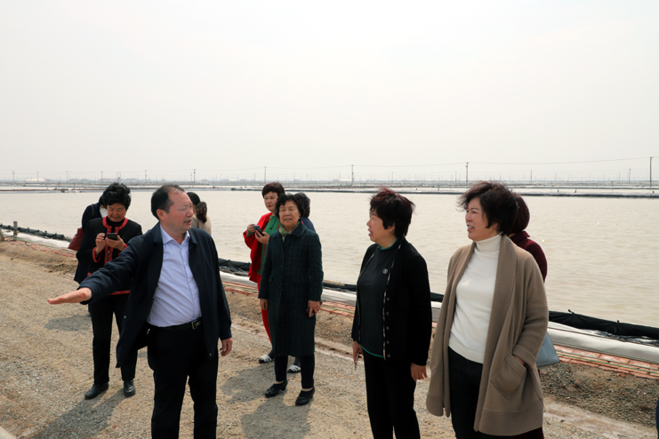 在日晒制盐生产一线,新式的带卤扒盐机械在盐田里工作着,女企业家们走上格堰滩头,用手中的手机记录下带卤扒盐的生产场景。李国文就原盐生产情况向女企业家们介绍:现在看到的是日晒制盐公司春扒现场,结晶池里的是T30扒盐机,通过盐泵把结晶池里的原盐输送到对面的廪基中。