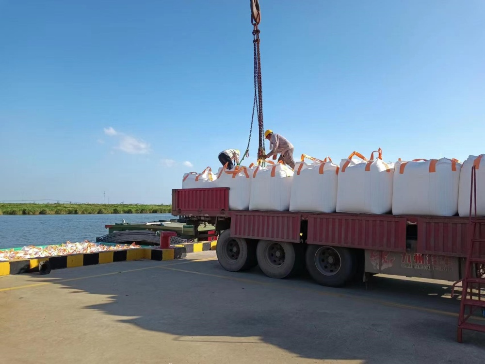 在火辣辣的太阳无情地照射下,一群勤劳的码头工人们正在调度着车辆和船只的进出,确保吨袋运输过程的顺畅无阻。另外几个工人正操纵着高大的吊机,他们小心翼翼地装卸着货物,每一个动作都显得格外谨慎。整个码头被一种热烈而紧张的“高温”氛围所笼罩,仿佛连空气都因为这份热情而变得灼热起来。