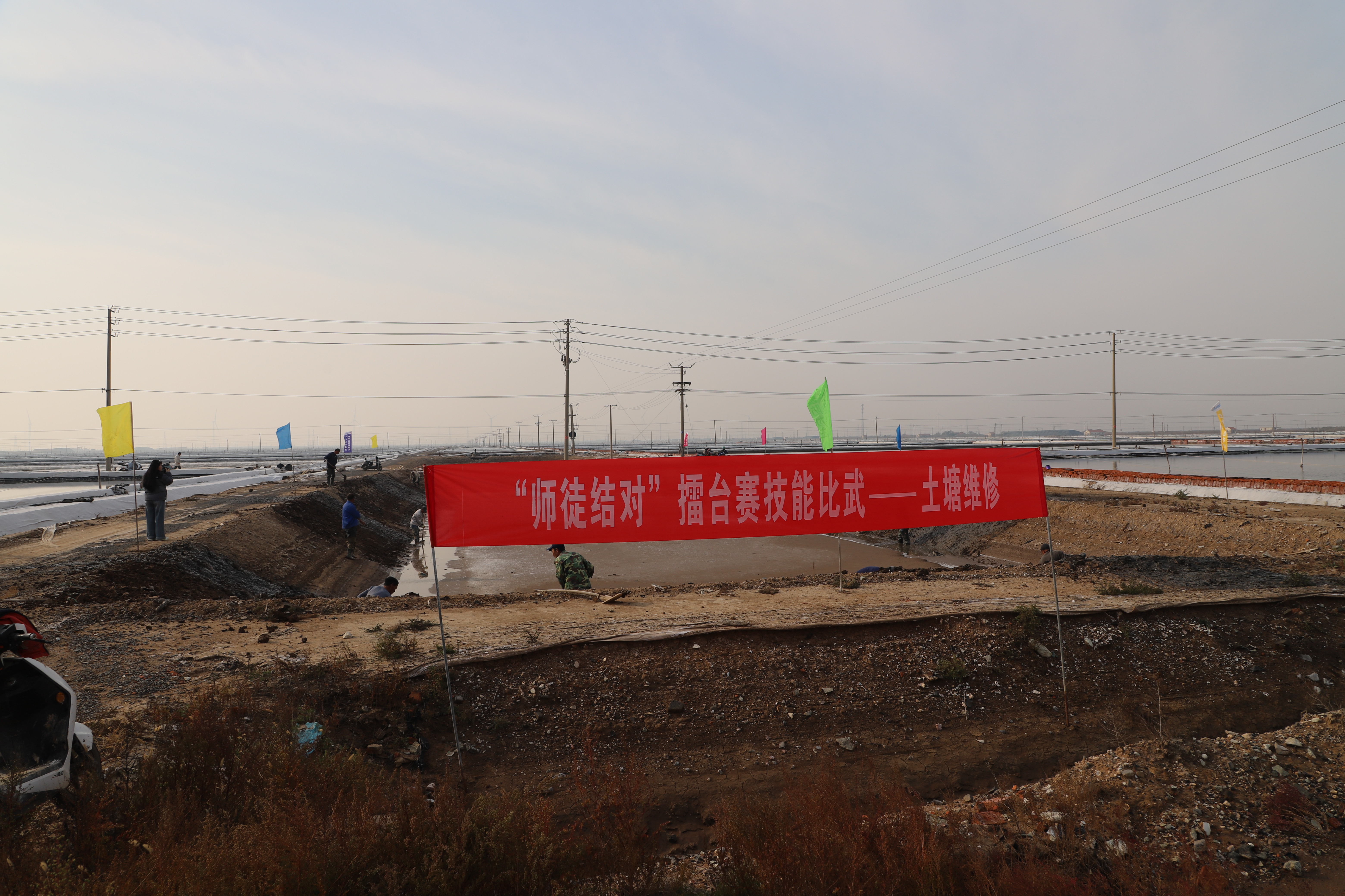 寒冬时节,暖阳之下,盐廪之旁,晒得黝黑的盐场产业工人们按照竞赛的考核标准,做熟泥、打堰墙、做堰顶,护埝顶、夯埝坡、清塘底,由此,见证了一场技能比拼的盛会。