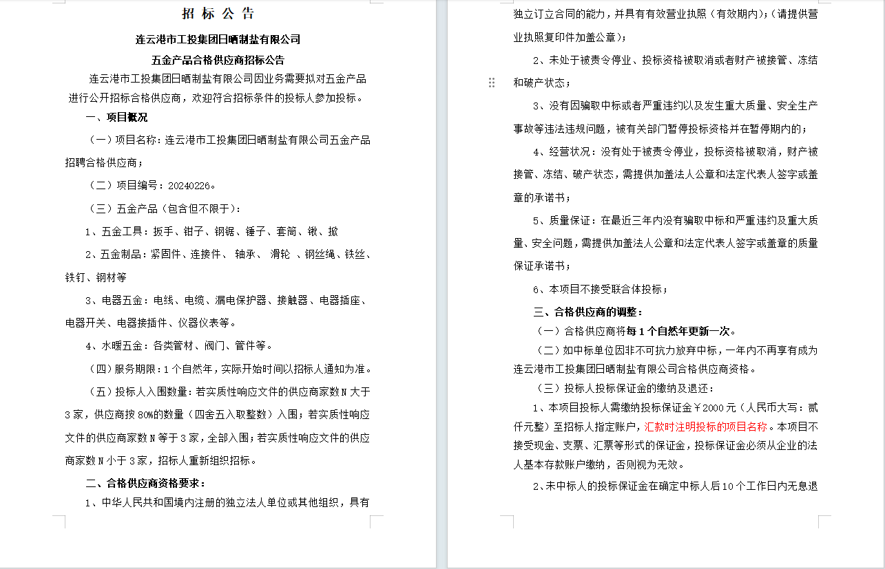 连云港市工投半岛平台网站登录入口_半岛(中国)日晒制盐有限公司五金产品合格供应商招标公告