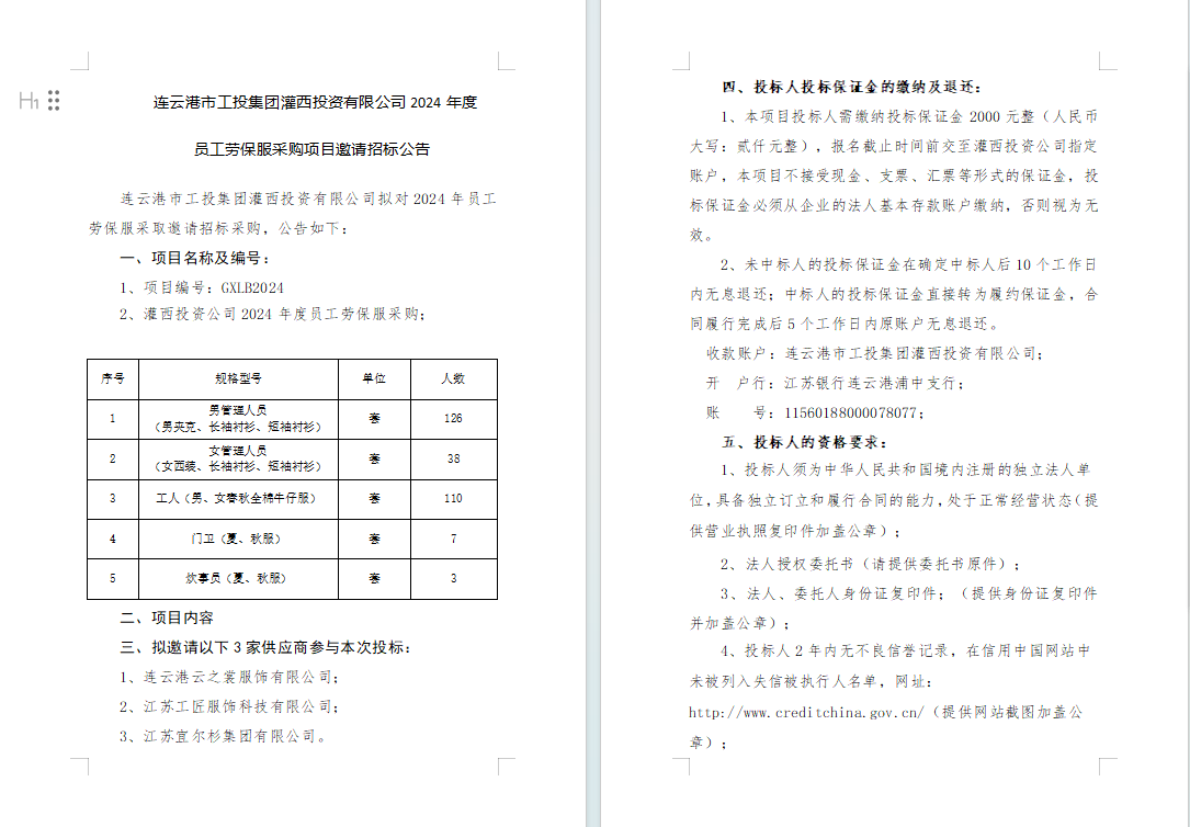 连云港市工投半岛平台网站登录入口_半岛(中国)灌西投资有限公司2024年度员工劳保服采购项目邀请招标公告