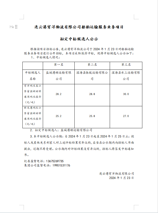 连云港宵洋物流有限公司船舶运输服务业务项目拟定中标候选人公示