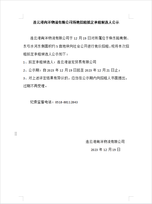 连云港宵洋物流有限公司场地招租拟定承租候选人公示