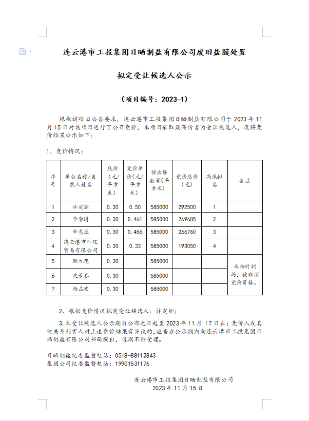 连云港市工投半岛平台网站登录入口_半岛(中国)日晒制盐有限公司废旧盐膜处置拟定受让候选人公示
