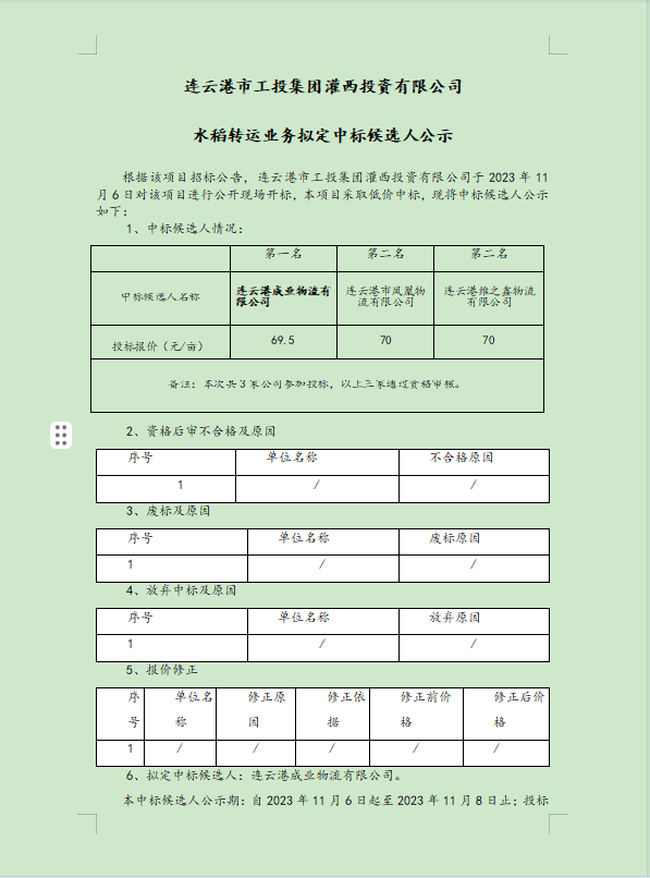 连云港市工投半岛平台网站登录入口_半岛(中国)灌西投资有限公司水稻转运业务拟定中标候选人公示