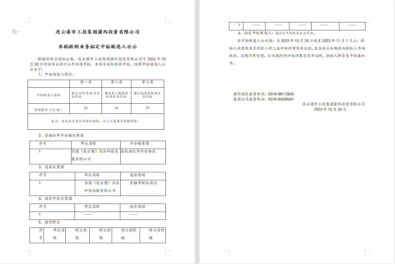 连云港市工投半岛平台网站登录入口_半岛(中国)灌西投资有限公司水稻收割业务拟定中标候选人公示