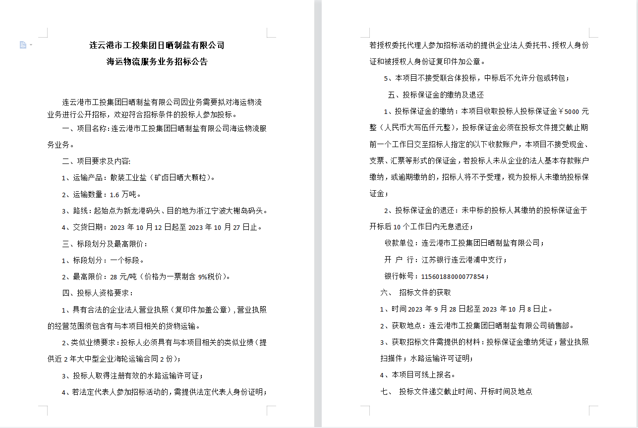 连云港市工投半岛平台网站登录入口_半岛(中国)日晒制盐有限公司海运物流服务业务招标公告