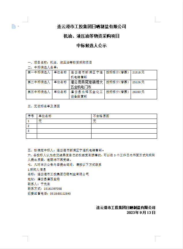连云港市工投半岛平台网站登录入口_半岛(中国)日晒制盐有限公司 机油、液压油等物资采购项目中标候选人公示