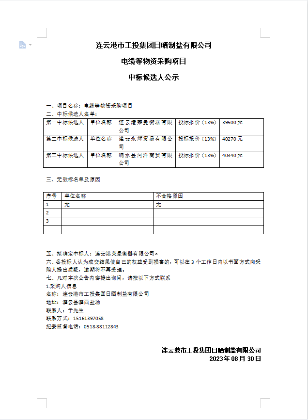 连云港市工投半岛平台网站登录入口_半岛(中国)日晒制盐有限公司电缆等物资采购项目中标候选人公示
