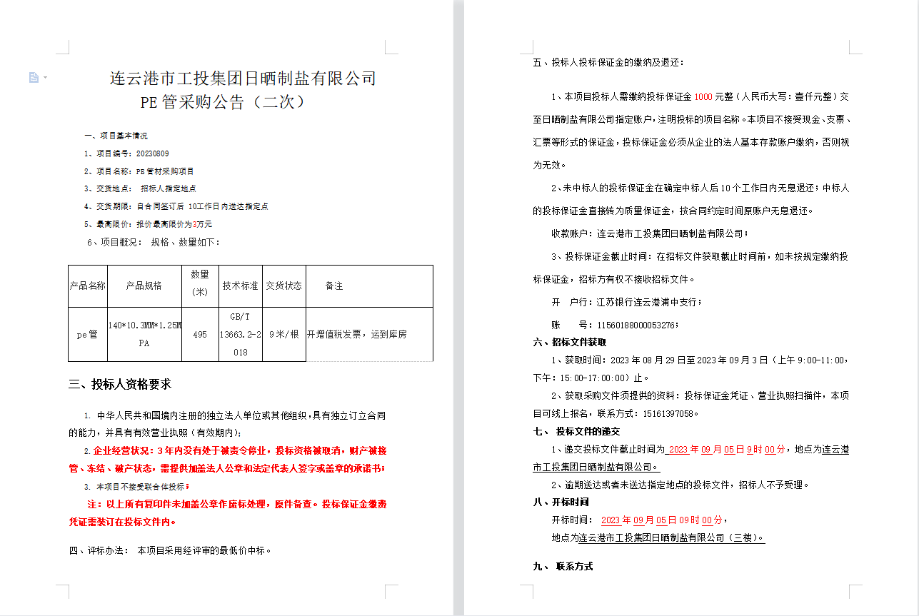 连云港市工投半岛平台网站登录入口_半岛(中国)日晒制盐有限公司PE管采购公告(二次)