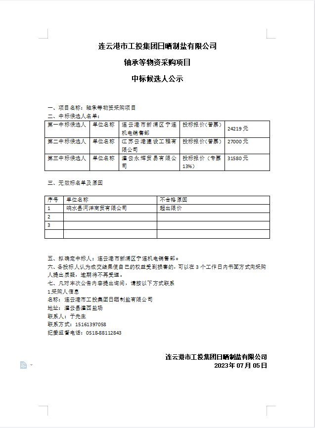 连云港市工投半岛平台网站登录入口_半岛(中国)日晒制盐有限公司轴承等物资采购项目中标候选人公示