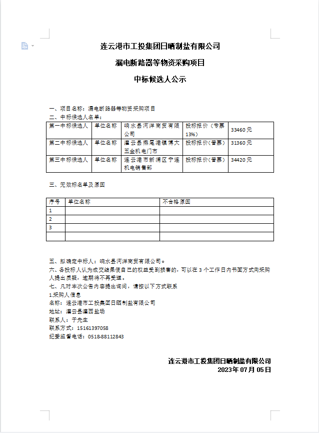 连云港市工投半岛平台网站登录入口_半岛(中国)日晒制盐有限公司漏电断路器等物资采购项目中标候选人公示