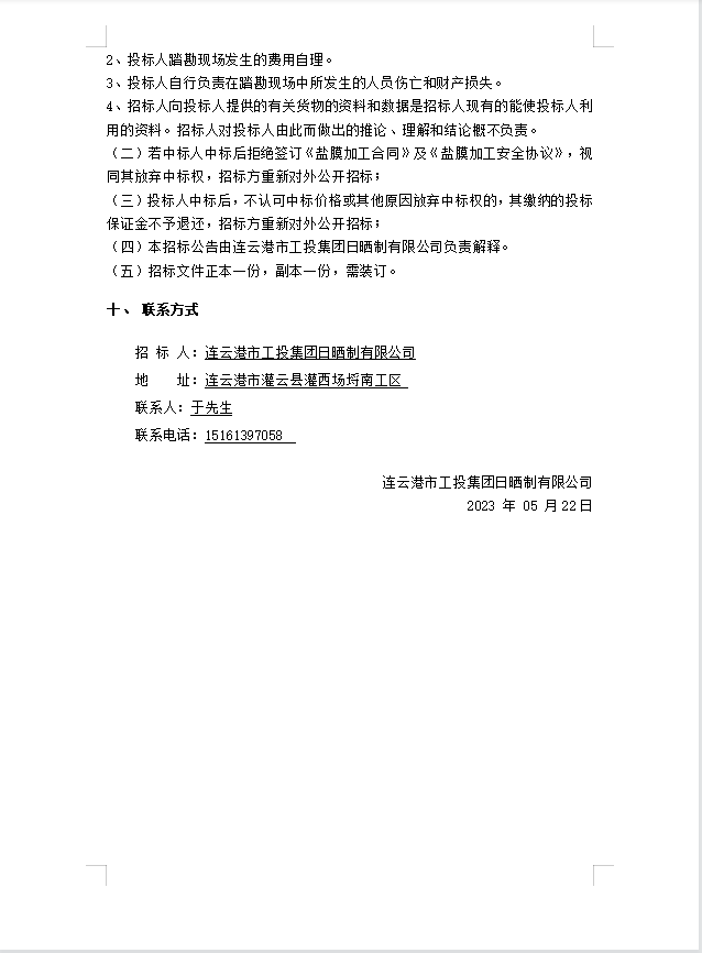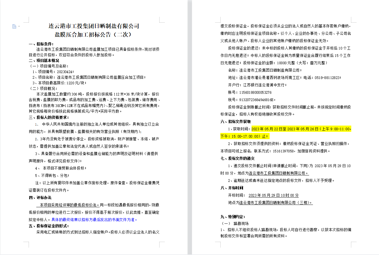 连云港市工投半岛平台网站登录入口_半岛(中国)日晒制盐有限公司盐膜压合加工招标公告(二次)