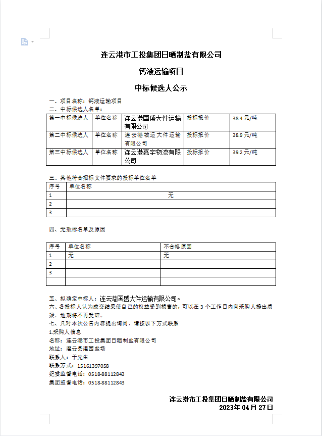 连云港市工投半岛平台网站登录入口_半岛(中国)日晒制盐有限公司钙液运输项目中标候选人公示