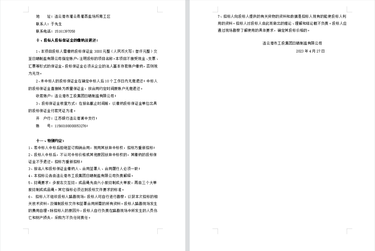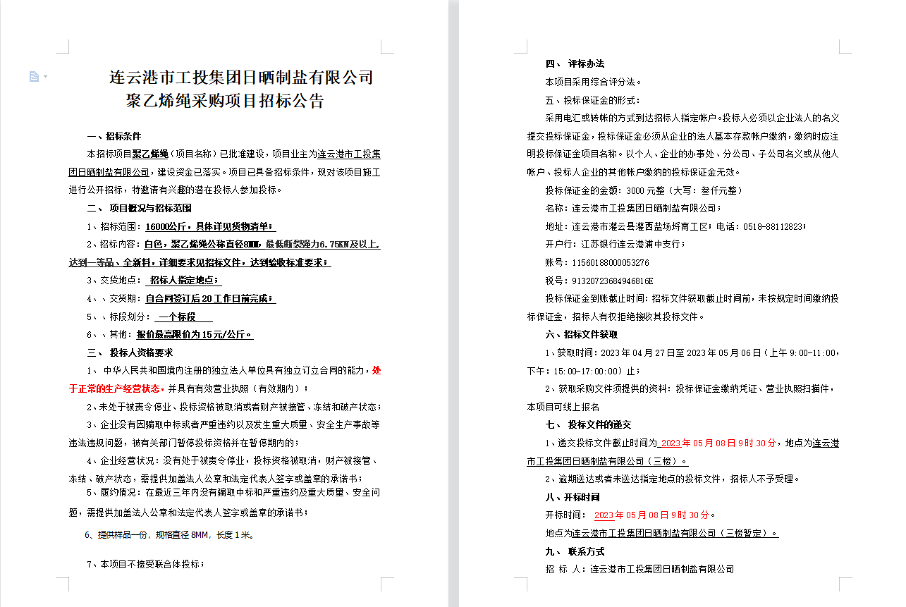 连云港市工投半岛平台网站登录入口_半岛(中国)日晒制盐有限公司聚乙烯绳采购项目招标公告