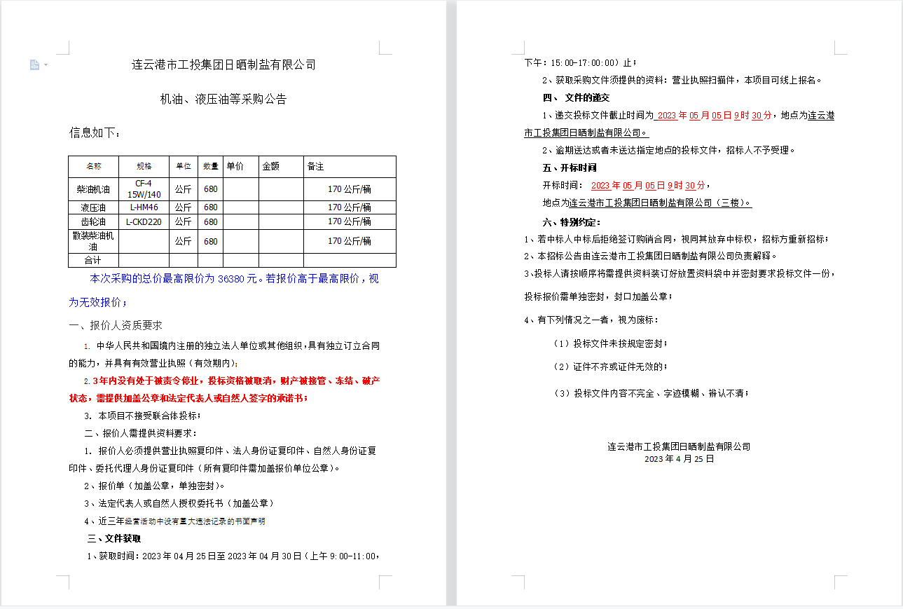 连云港市工投半岛平台网站登录入口_半岛(中国)日晒制盐有限公司 机油、液压油等采购公告
