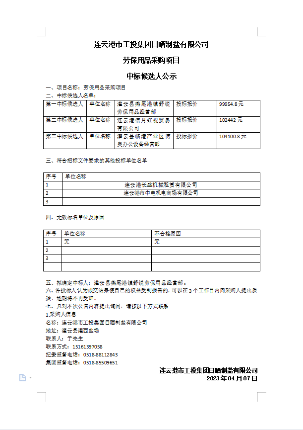 连云港市工投半岛平台网站登录入口_半岛(中国)日晒制盐有限公司劳保用品采购项目