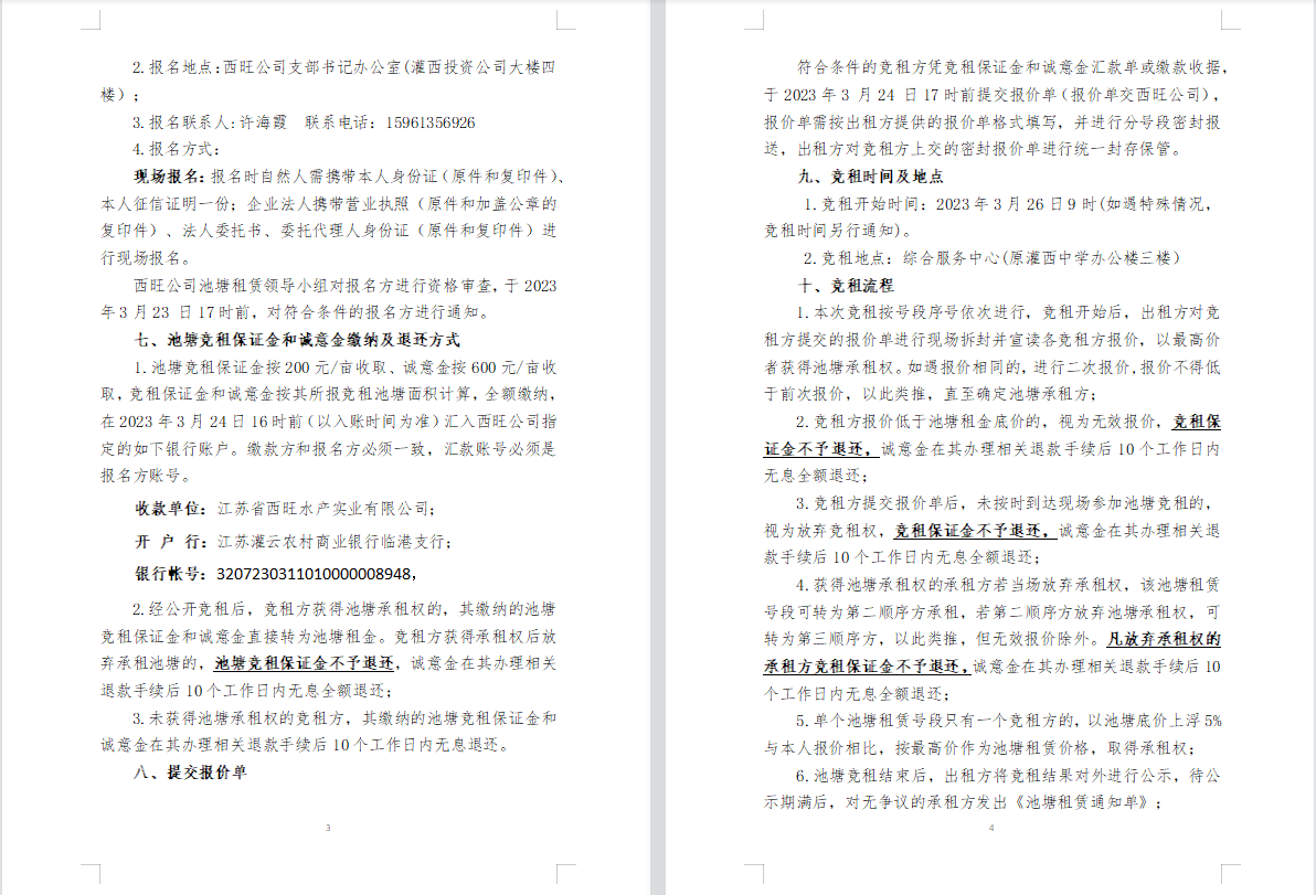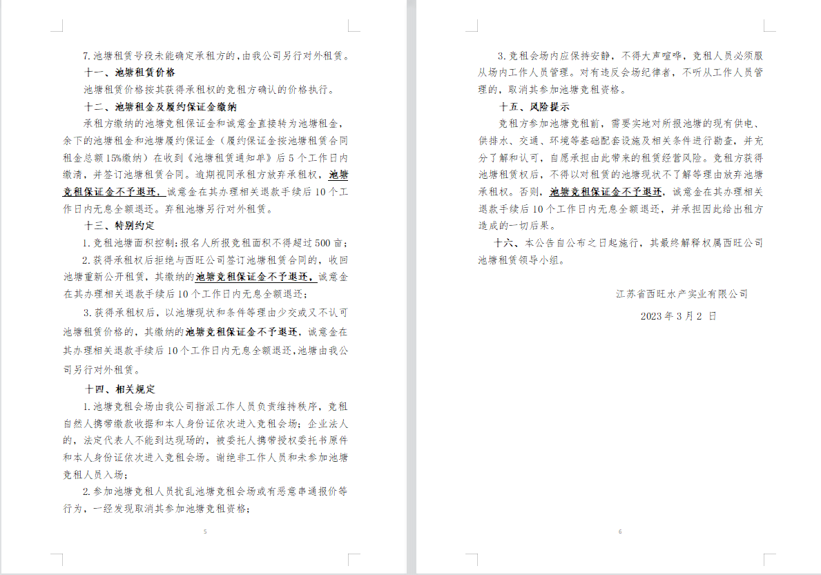 江苏省西旺水产实业有限公司2023年度淡水养殖池塘公开竞租公告