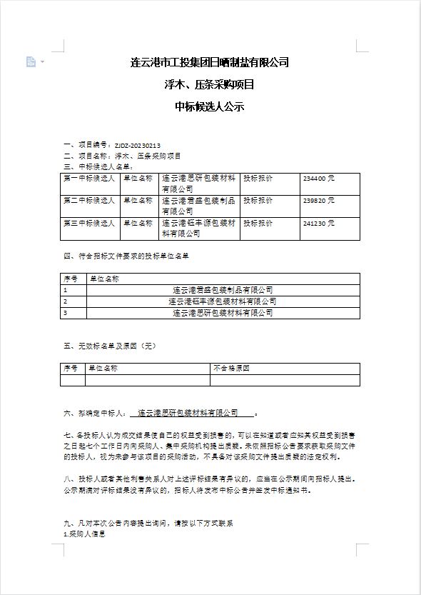 连云港市工投半岛平台网站登录入口_半岛(中国)日晒制盐有限公司浮木、压条采购项目中标候选人公示