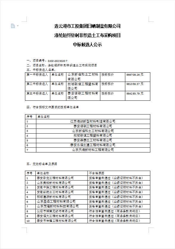 连云港市工投半岛平台网站登录入口_半岛(中国)日晒制盐有限公司涤纶短纤针刺非织造土工布采购项目中标候选人公示