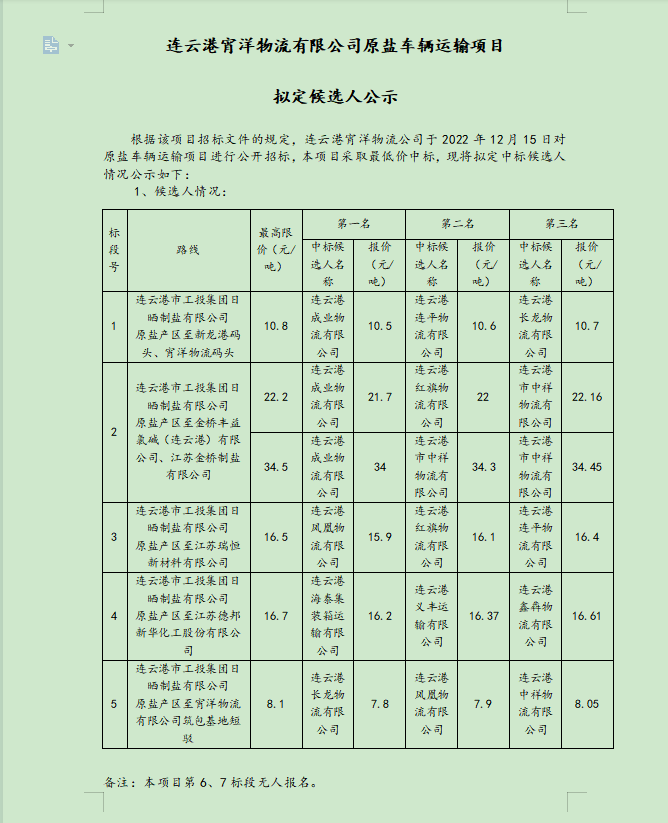 连云港宵洋物流有限公司原盐车辆运输项目拟定候选人公示
