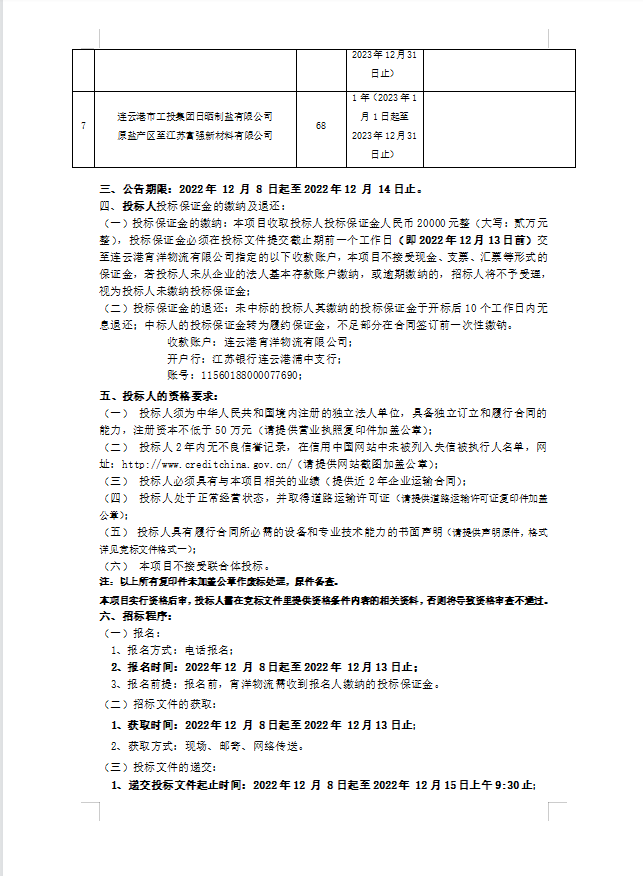 连云港宵洋物流有限公司原盐车辆运输项目招标公告
