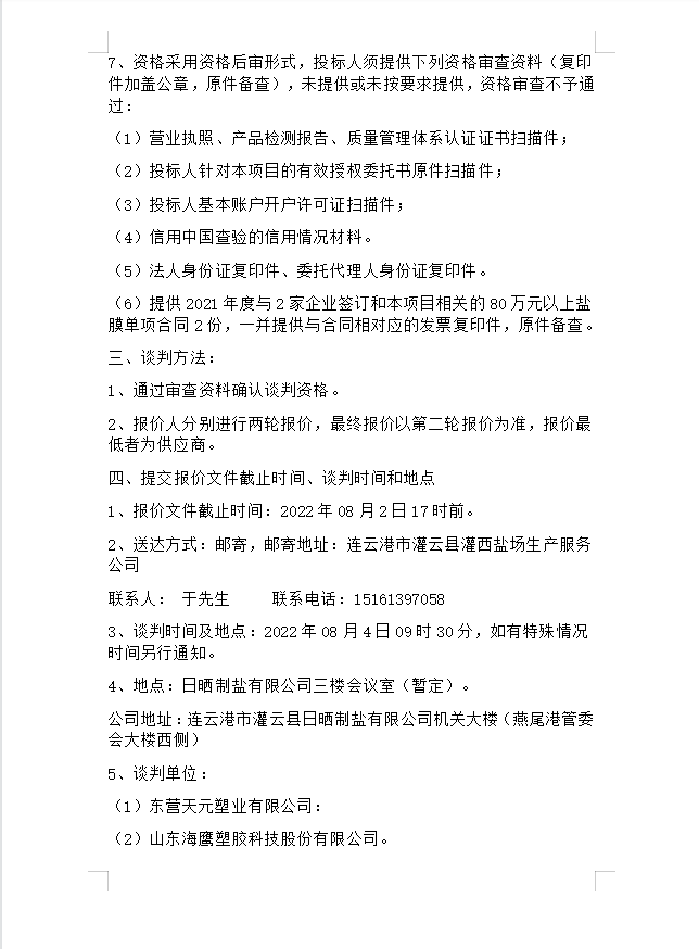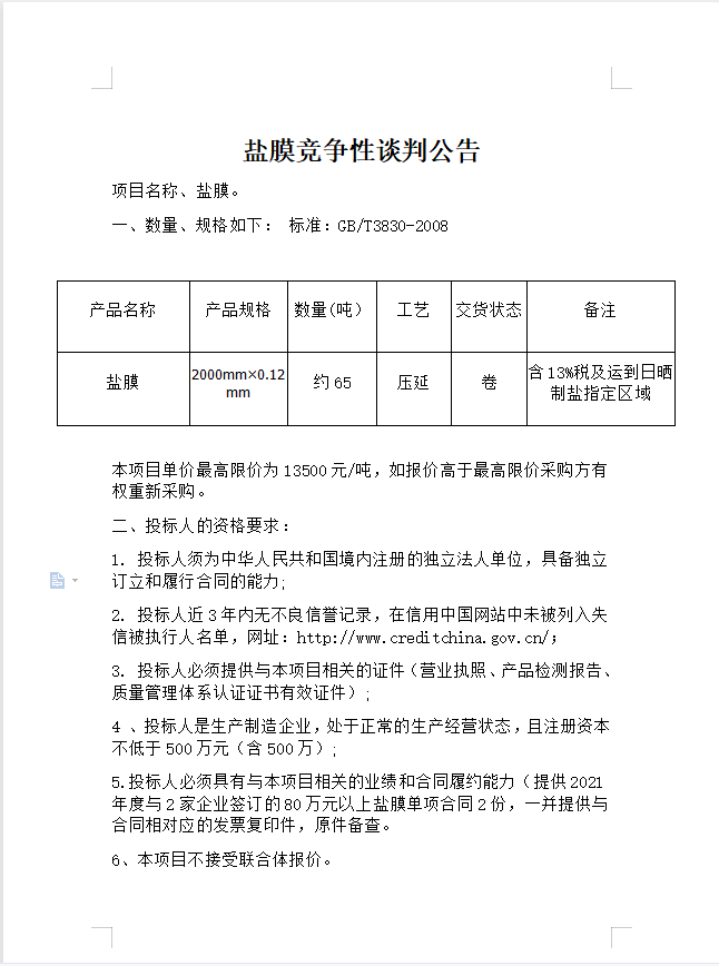 盐膜竞争性谈判公告