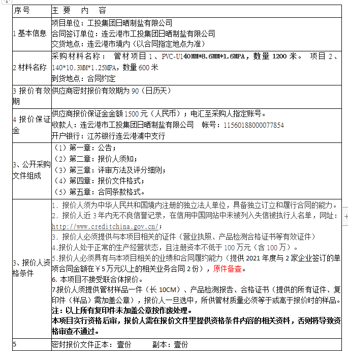 7.报价人须提供样品一件(长10公分)、产品检测报告、合格证书(提供的所有证件、复印件(样品)需加标签并加盖公章),确定为供应商后,所供管材质量必须等于或高于报价时的样品管材。